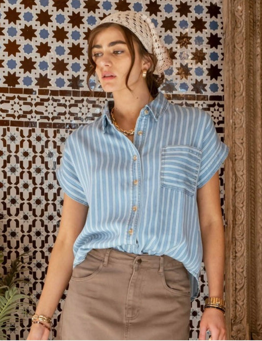 Stripe Chambray Short Sleeve Button Down Shirt